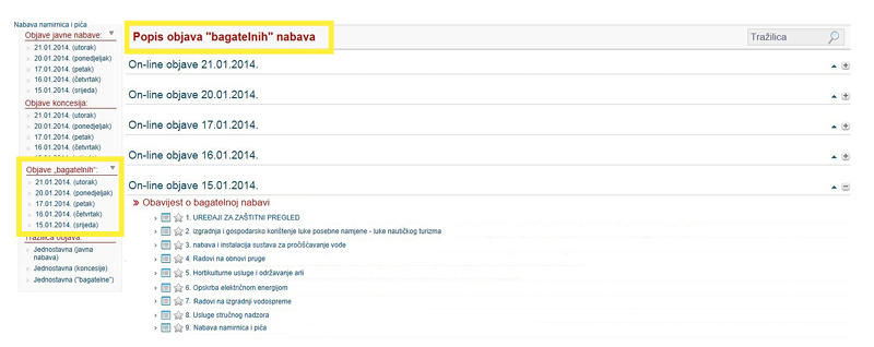 Objave bagatelnih nabava nalazit će se na izdvojenom popisu objava na Elektroničkom oglasniku javne nabave RH.